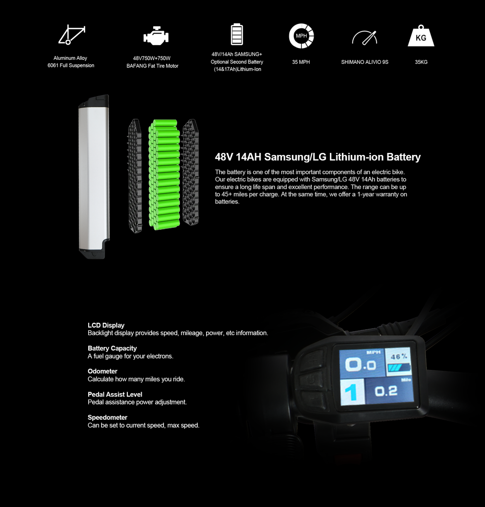 - Exceptional Range: Travel up to 80+ miles on a single charge with the high-capacity 48V17Ah Samsung lithium-ion batteries.